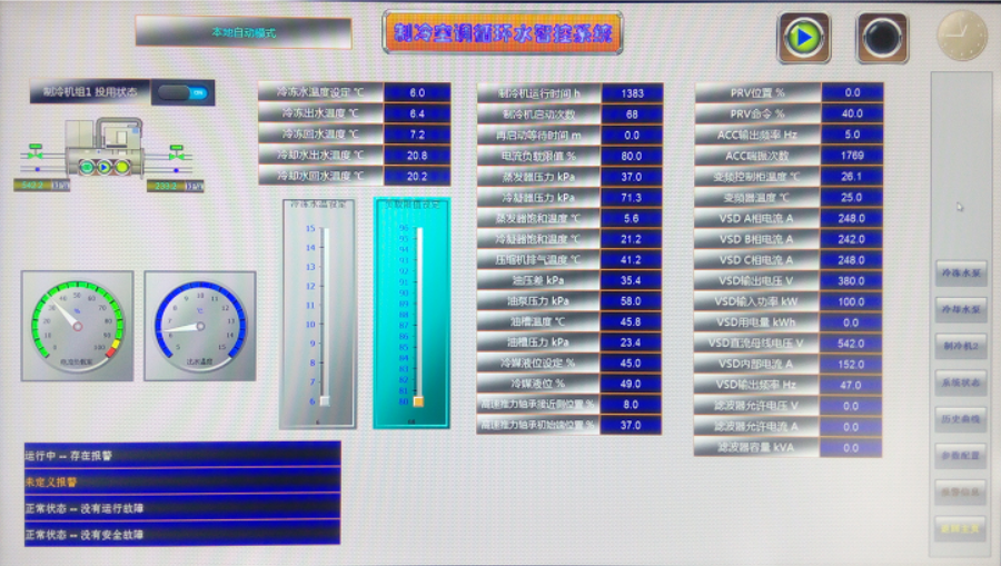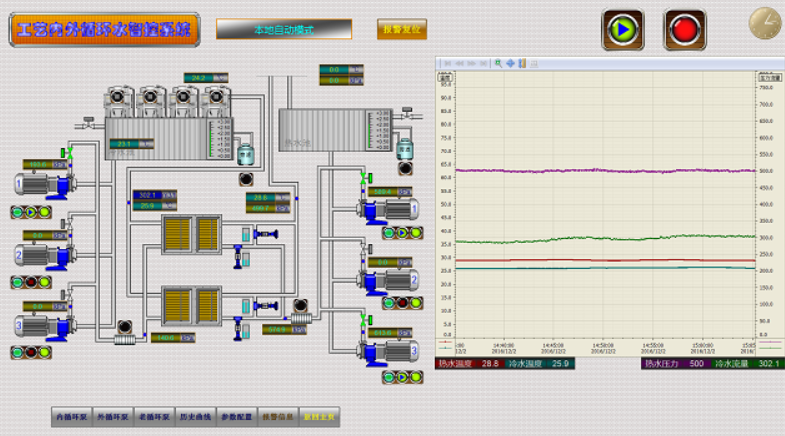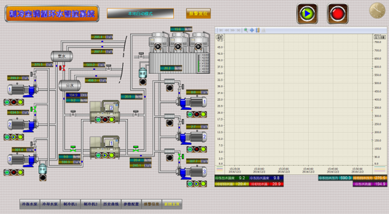 此項(xiàng)目采用西門子S7-300 PLC控制系統(tǒng)和分布式IO控制站、WinCC上位機(jī)監(jiān)控采集系統(tǒng),充分運(yùn)用優(yōu)化的邏輯控制流程,并通過數(shù)字控制算法,調(diào)節(jié)各變頻泵、變頻冷水機(jī)組、電控調(diào)節(jié)閥,保證機(jī)組、水泵、冷卻塔投用及切換充分合理優(yōu)化,同時(shí)又能快速穩(wěn)定地響應(yīng)全部試驗(yàn)間、生產(chǎn)車間在全范圍內(nèi)的負(fù)荷切換和波動(dòng),保持環(huán)境空調(diào)冷水、工藝試驗(yàn)冷水、燃油冷水的工藝參數(shù)穩(wěn)定。在保證生產(chǎn)試驗(yàn)要求的基礎(chǔ)上實(shí)現(xiàn)經(jīng)濟(jì)節(jié)能運(yùn)行控制。